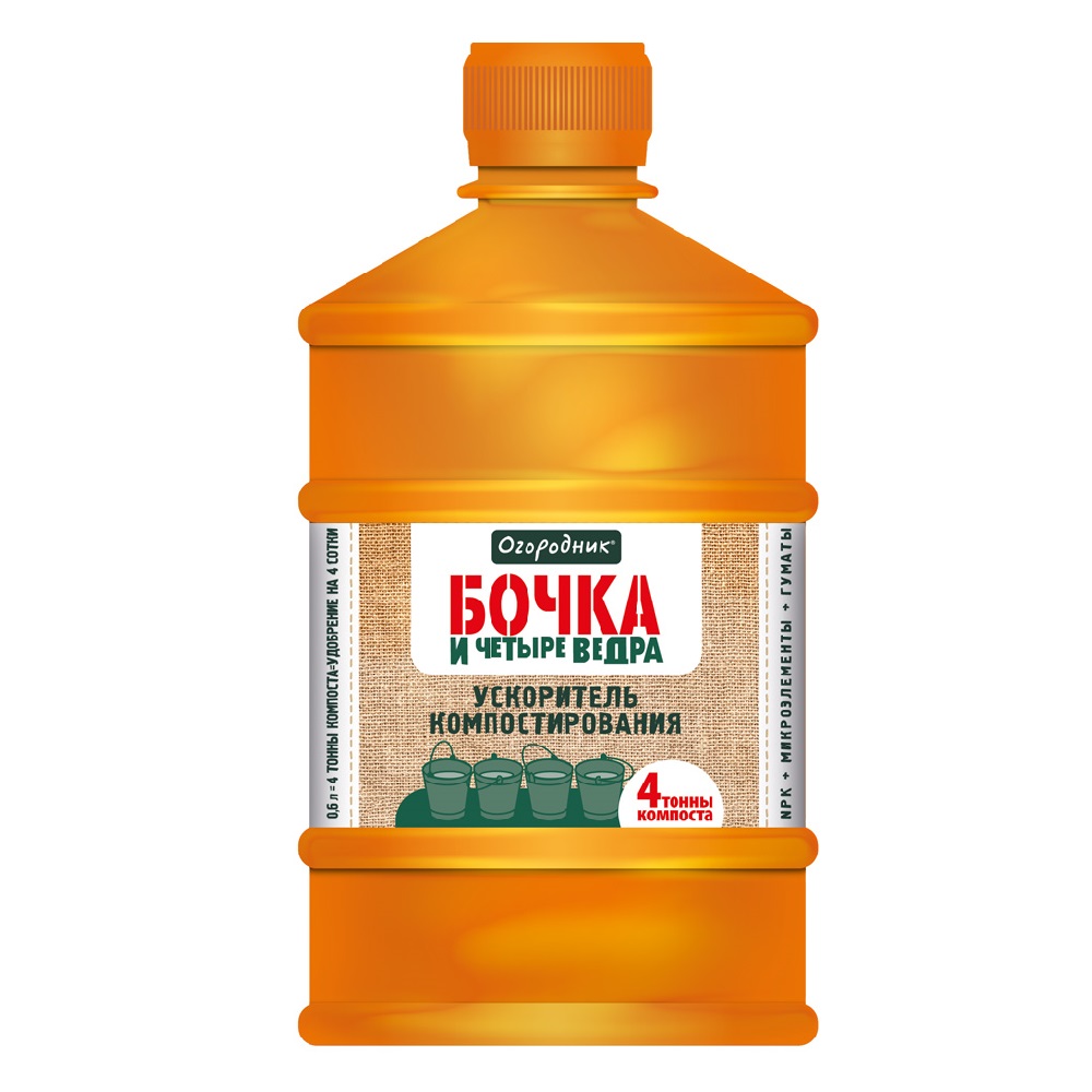 Ускоритель компостирования Бочка и четыре ведра это жидкое средство для ускорения приготовления компоста. С помощью 1 литра ускорителя компостирования можно произвести 6 т компоста (хватает на 6 соток).
